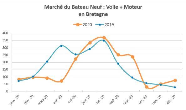 La courbe orange représente les immatriculations de bateaux neufs en Bretagne en 2020. Nous remarquons un décalage dans le temps des ventes de bateaux neufs lié au Covid-19.